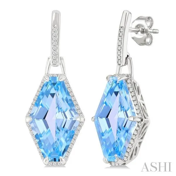 (706) 543-465316x10 MM Hexagon Shape Blue Topaz and 1/4 Ctw Round Cut Diamond Halo Semi-Precious Earrings in 14K White Gold