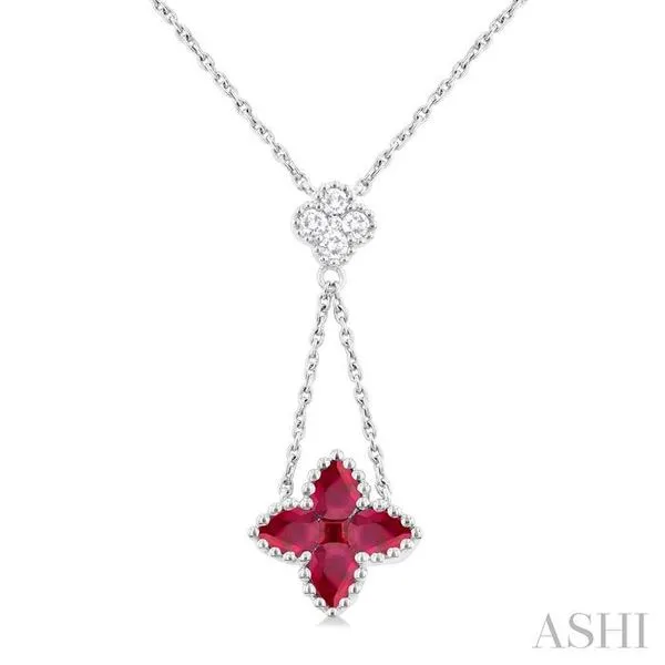 (706) 543-46534x3 MM Pear Cut & 2.1 MM Princess Cut Ruby and 1/10 Ctw Round Cut Diamond Floral Blossom Precious Necklace in 14K White Gold