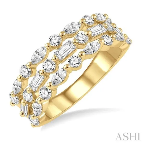 (706) 543-46531 1/2 Ctw Triple Row Baguette, Marquise and Round Cut Diamond Fashion Band in 14K Yellow Gold