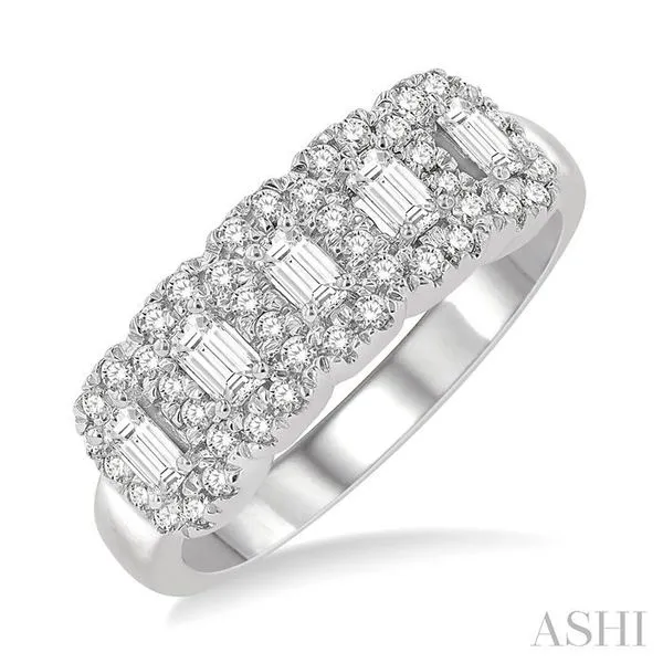 (706) 543-46531 Ctw Emerald Shape 5 Stone Emerald & Round Cut Diamond Halo Wedding Band in 14K White Gold