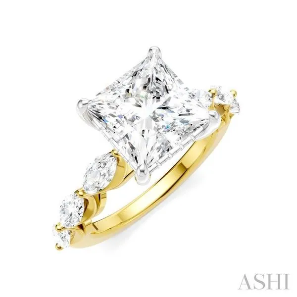 3. 1 Ctw Princess Shape Marquise and Round Cut Diamond Semi-Mount Engagement Ring in 14K Yellow and White Gold